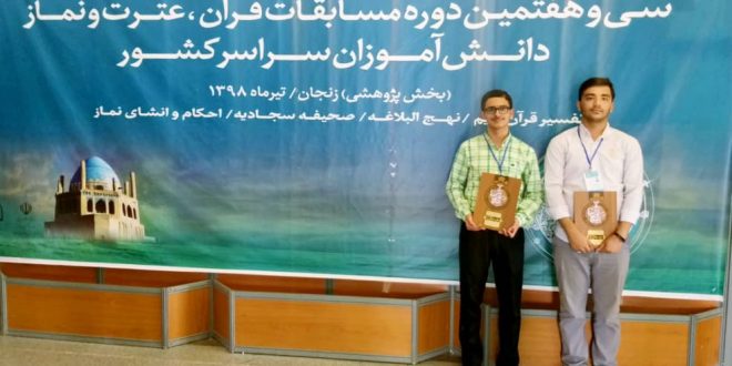 به گزارش روابط عمومی مدیریت آموزش و پرورش کازرون، هادی زال زاده با اشاره به برگزاری مراسم اختتامیه و اعلام نتایج سی و هفتمین دوره بخش پژوهشیِ مسابقات قرآن، نماز و عترت دانش آموزان در زنجان اظهار کرد: محمدمهدی نبوی و محمدرضا مرحمتی زاده هر دو از دبیرستان شهید دستغیب این شهر در رشته انشاء نماز به ترتیب رتبه های اول و چهارم کشور را کسب کردند.