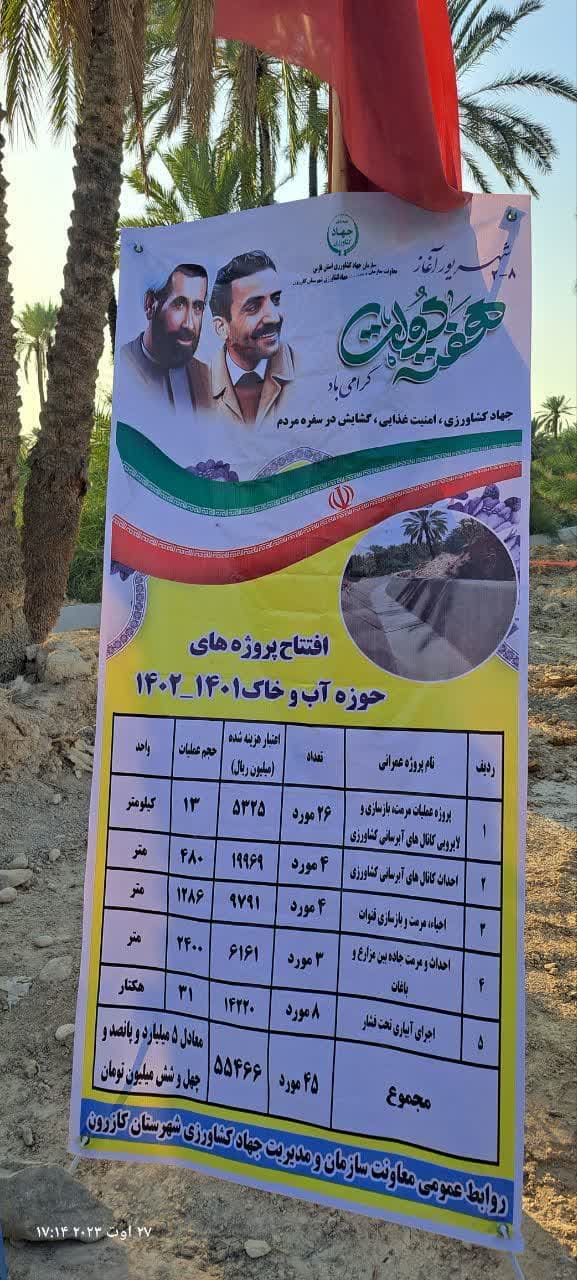 به گزارش زینب صادقی به نقل از روابط عمومی مدیریت جهاد کشاورزی شهرستان کازرون ،حمید رشیدی با اشاره به اینکه آئین آغاز بهره برداری از این طرح ها با حضور محمد فرخ زاده معاون هماهنگی امور زائرین و گردشگری استان فارس صورت گرفت، تصریح کرد: این ۴۵ طرح شامل: مرمت، بازسازی ولایروبی کانال های آب رسان به طول ۱۳کیلومتر احیاء و مرمت و بازسازی قنوات به طول ۱۲۸۶ متر